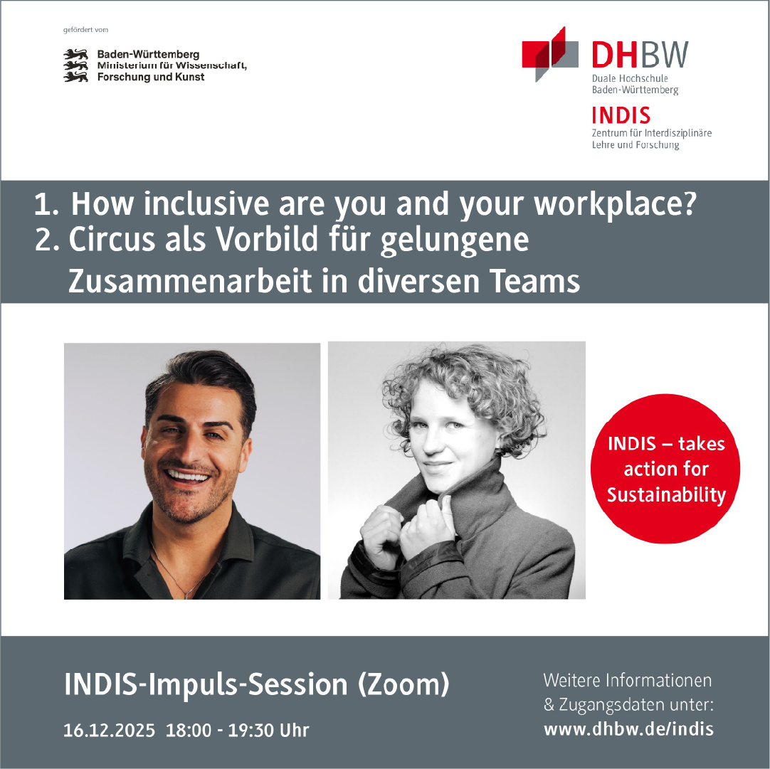 Das Zentrum für Interdisziplinäre Lehre und Forschung (INDIS) lädt alle Interessierten der DHBW zu Online-Impulsvorträgen ein. Lilith Diringer erklärt, was Teams aus der Kultur- und Kreativbranche – besonders aus dem Circus – über Hochrisikoentscheidungen, Teamzusammenhalt und psychologische Sicherheit lernen können und wie sich diese Erkenntnisse auf moderne Arbeits- und Teamstrukturen übertragen lassen. Und Charbel Garbo wird in seinem Vortrag in englischer Sprache über die Förderung interkulturellen Verständnisses, die Reduzierung kultureller Konflikte sowie die Stärkung von Diversität und Inklusion in Führung und Organisationen erzählen. Kommen Sie vorbei!